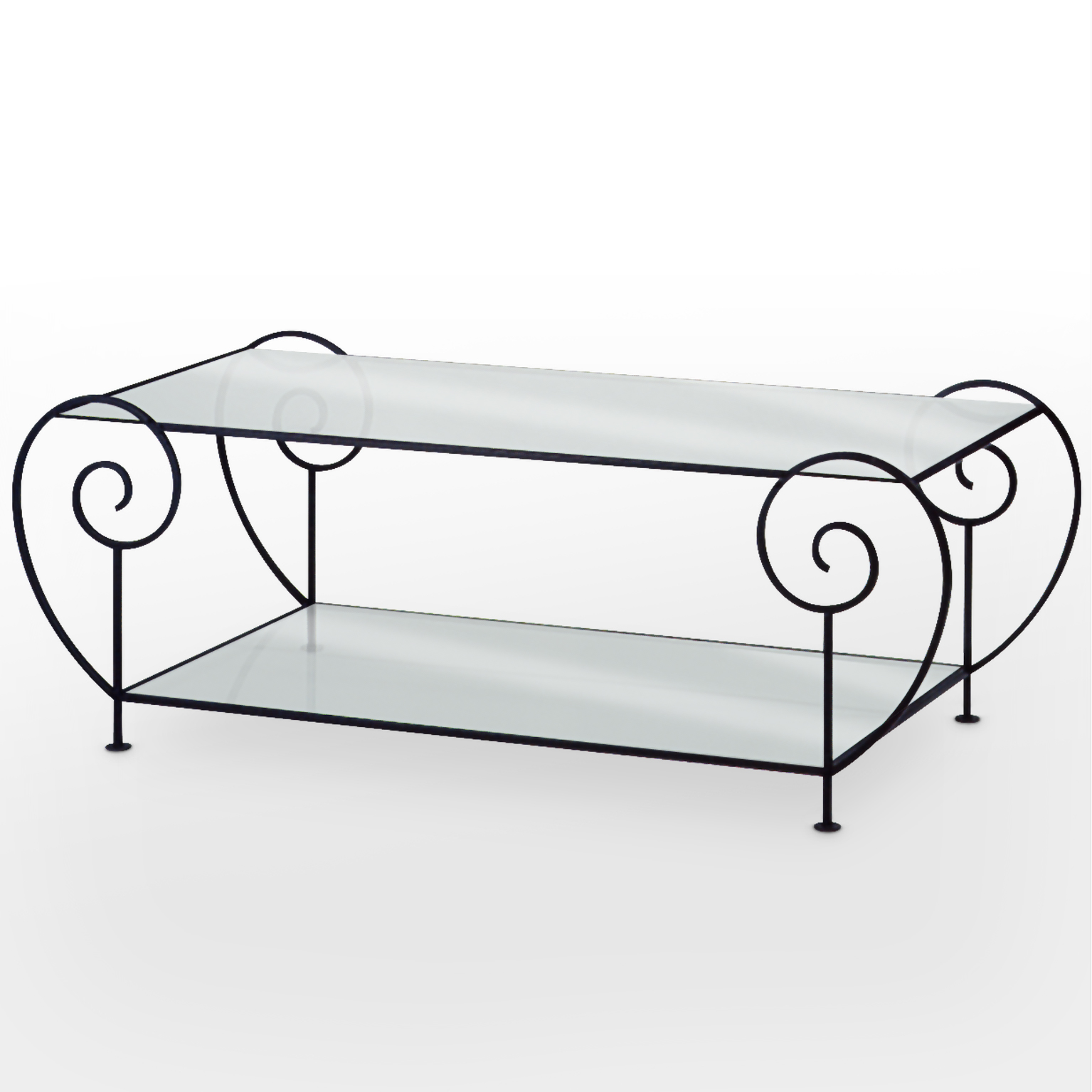 Mesa de centro numa estrutura em ferro, com dois tampos em vidro.