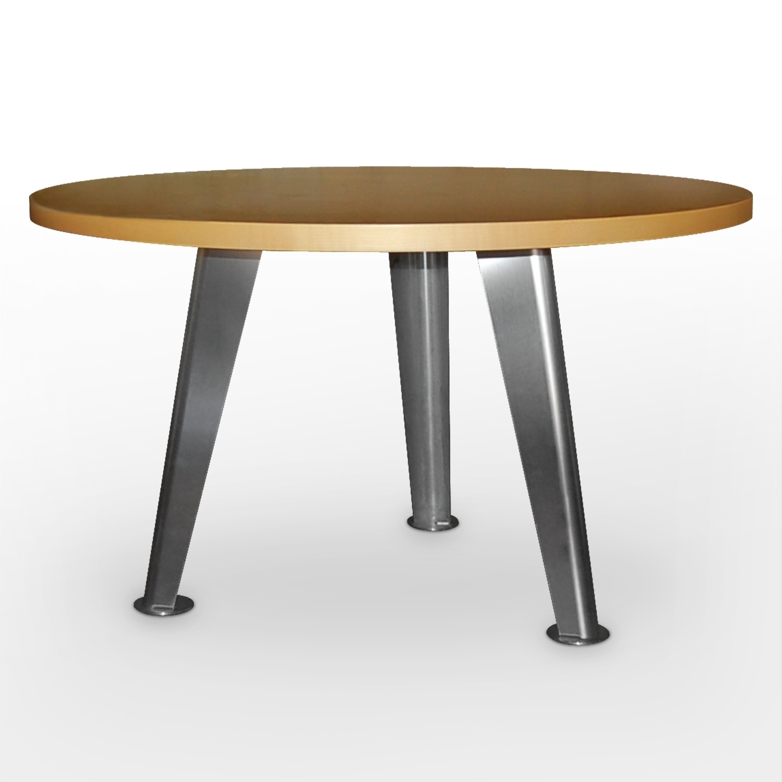 Mesa redonda com tampo em madeira clara sobre 3 pés em metal.