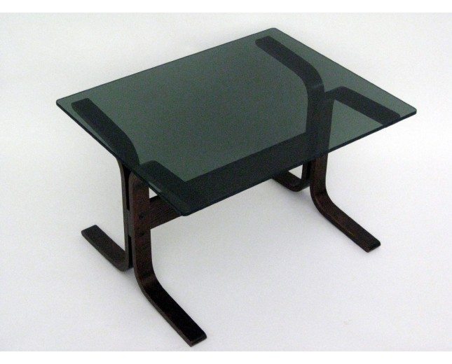 Mesa com tampo rectangular em vidro preto translúcido assente em 4 pés de madeira.